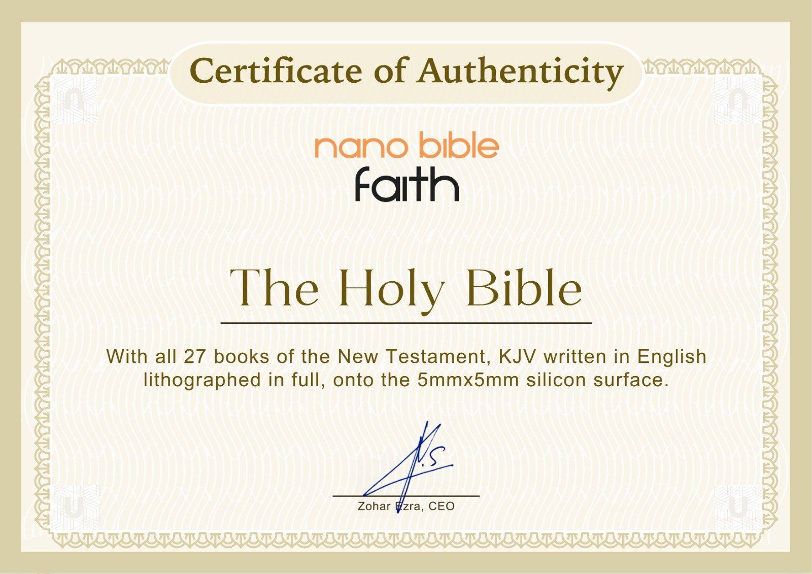 The Nano Bible, including the 27 books of the Bible, expresses the belief in one God and is an integral part of the existence of every believing Christian. The great importance of the Bible, which is considered the best-selling book in the world, is that it was the source of the groundbreaking initiative in the form of the Nano Bible - A tiny book of the Bible that allows anyone to carry the entire book of the Bible on their heart's tablet. The miniature Bible is produced using a unique and exclusive technology of its kind in the world.