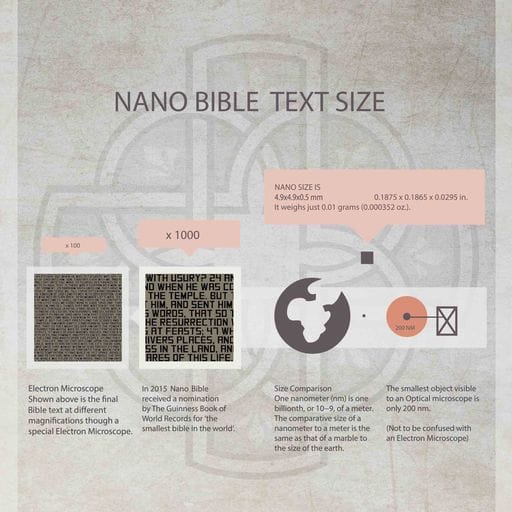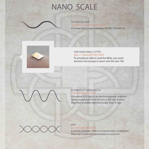 The nano Bible jewelry can only be read under a 1000x microscope. The size of an average letter is about 3.5 microns and the line thickness of a letter is 950 nanometers (0.95 microns). In comparison - the thickness of a human hair is between 20-50.