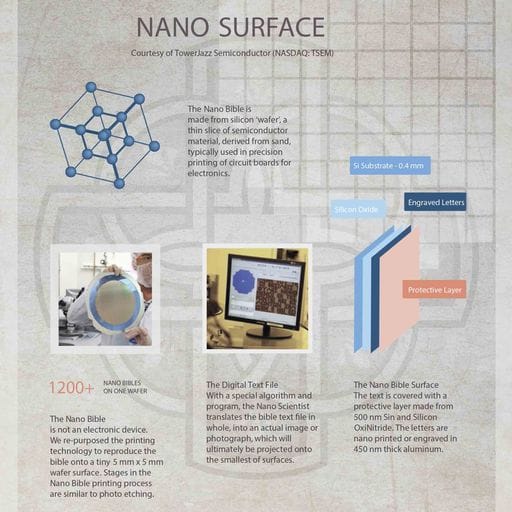 At the center of this Nano Bible jewelry is the entire text of the Old or New Testament shaped with microscopic precision. Nano Jewelry is a home for state-of-the-art made-in-Israel technologies and innovations in the service of the jewelry industry.